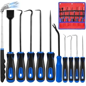Pick and Hook Tool Set:Shafted straight pick,curved hook,45-degree hook,and 90 degree pick tool includes 4 larger heavy duty automotive picks tools– 6 inchshafted straight mechanic pick(10”/25.5cm full length);Also includes 4 small o ring pick set – 3 inch with 3.5”grip handles (6.5”/16.5cm full length);made of high-quality heat-treated carbon steel.